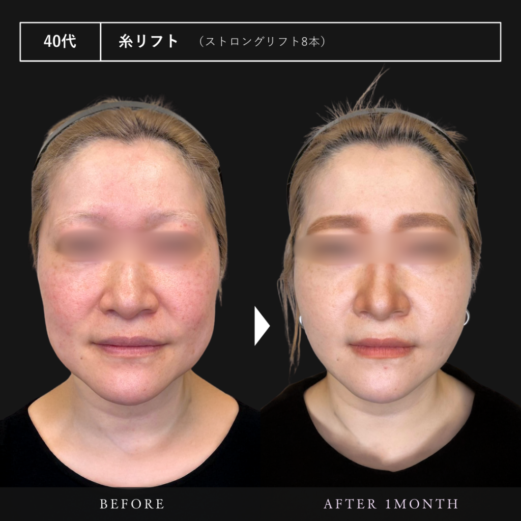 施術の説明:皮下に特殊な溶ける糸を挿入し、たるみを引き上げることで輪郭を整える施術。糸の刺激によってコラーゲン生成が促され、肌質改善も期待できます。