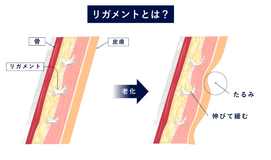 上から順に【皮膚 → 皮下脂肪 → 筋肉(SMAS) → 骨】と重なり合っており、それらは「リガメント(靭帯)」という強力な繊維で、骨にしっかりと固定されています。