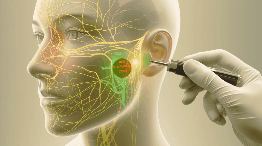 実は、これが最も恐ろしい点です。 人間の顔には、絶対に熱を加えてはいけない「危険地帯(リガメントや太い神経・血管)」が存在します。これらは皮膚の上からは見えません。
