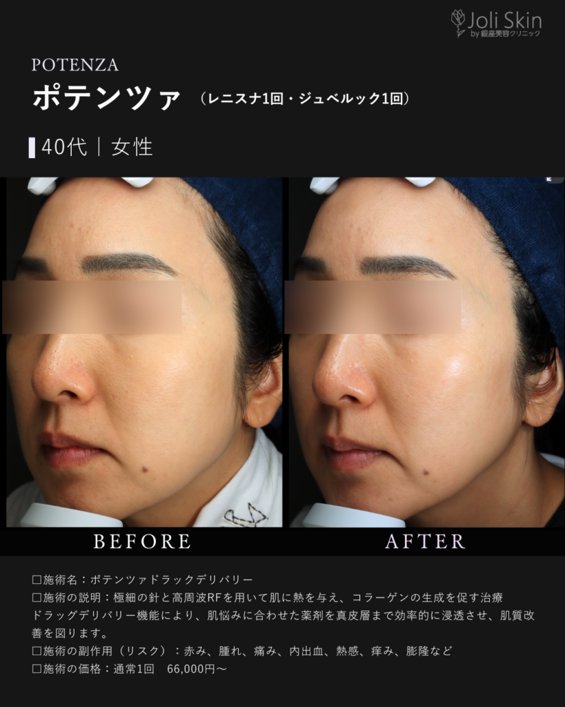 - 痛み: ポテンツァは針先からRFを照射して止血しながら施術するため、ダーマペンよりも痛みや出血が少ないのが特徴です。もちろん、麻酔クリームを使用し、痛みを最小限に抑えます。
