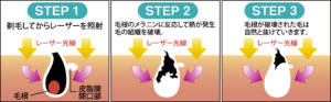 医療レーザーは毛の黒いメラニン色素によく反応するため、濃く太い部分の毛ほど抜けやすい傾向にあります。