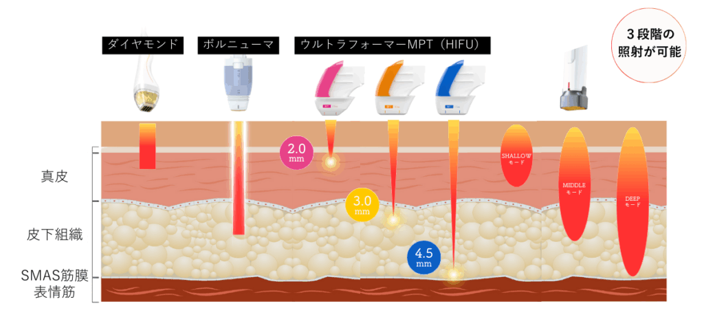 - SHALLOW(6.78MHz):真皮層にアプローチ。肌のハリ・ツヤ改善が期待できます。