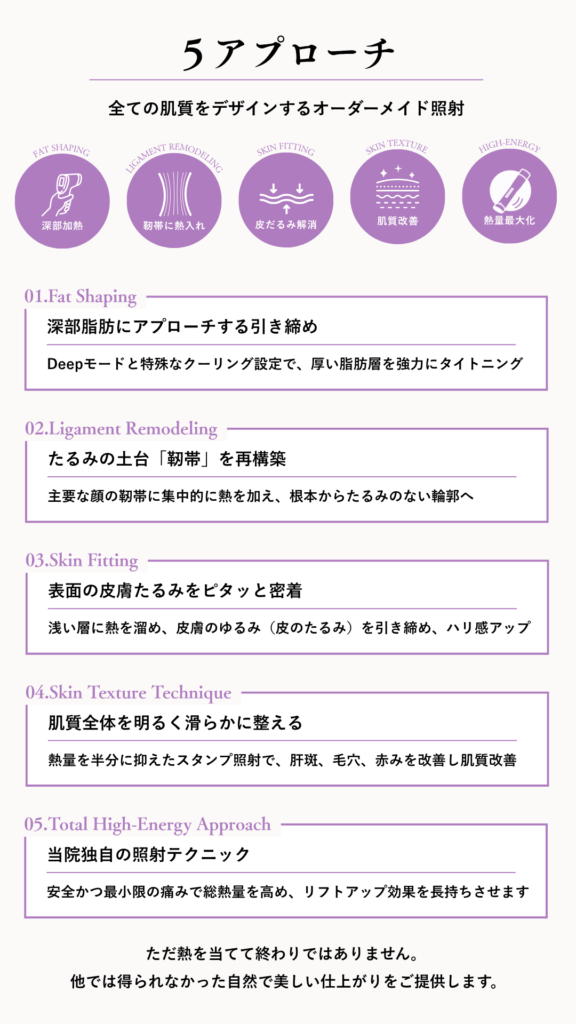 当院では、これら5つのアプローチを一律の設定で行うのではなく、骨格や脂肪のつき方、皮膚の厚み、たるみ方を診察したうえで、照射の順番や出力を細かく調整しています。