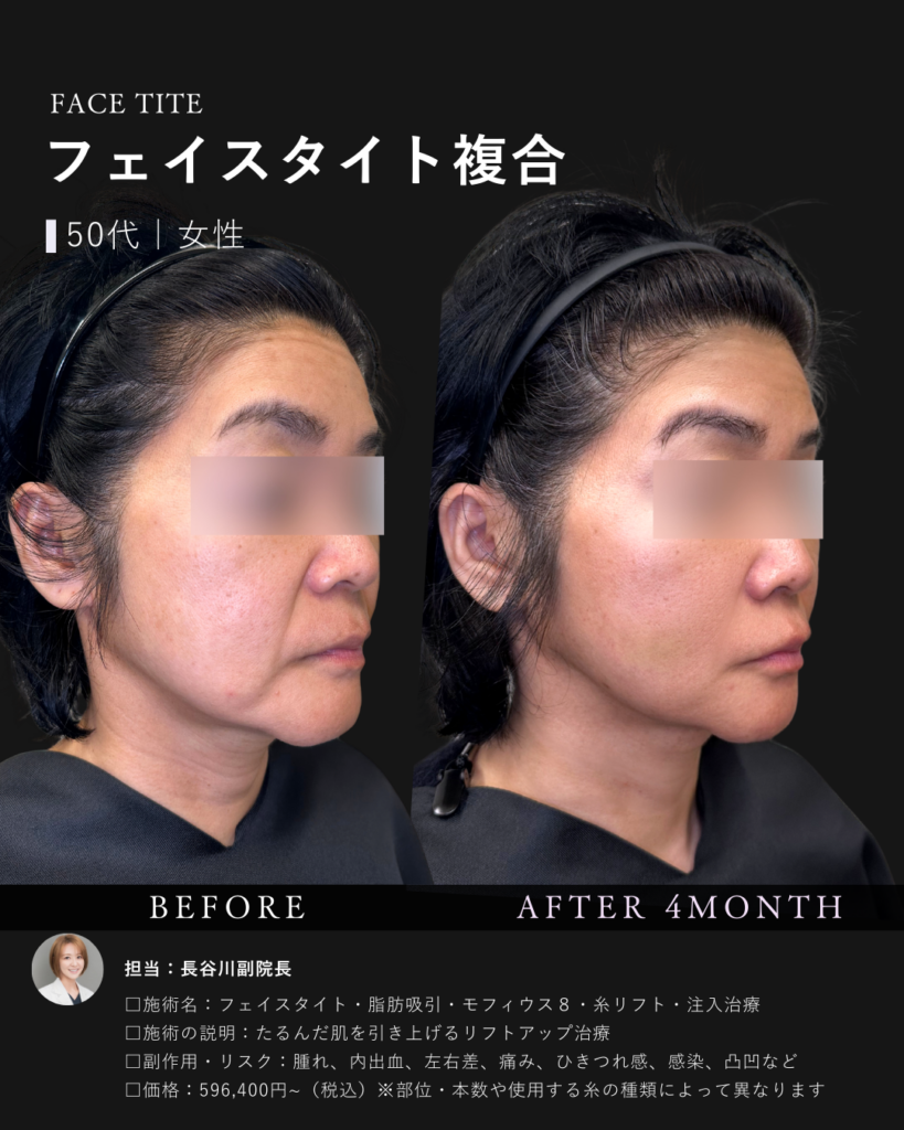脂肪吸引は脂肪を除去することが主目的ですが、フェイスタイトは脂肪除去と皮膚の引き締めを同時に行う点に大きな違いがあります。従来の脂肪吸引は皮膚のたるみを改善しにくいというデメリットがありましたが、フェイスタイトは強力な引き締め効果があるため、たるみのリスクを抑え、より滑らかでタイトな輪郭を実現します。