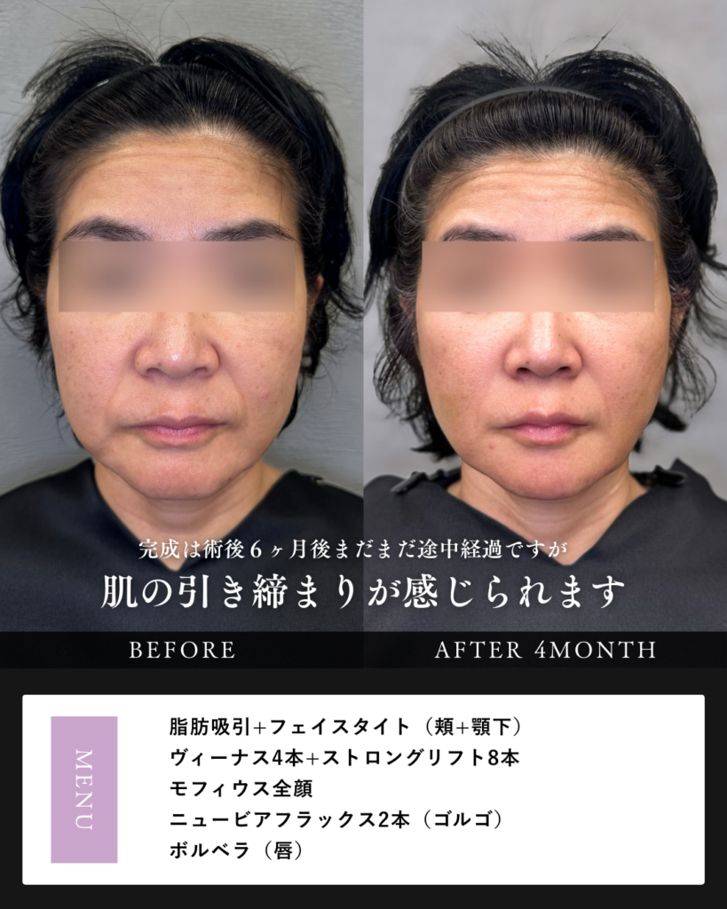 コラーゲンのリモデリング(再構築)が進むため、術後3ヶ月〜6ヶ月後に最大効果が現れます。持続期間: 脂肪自体を除去し、皮膚の組織そのものを引き締めるため、効果は約5年ほどと言われています。