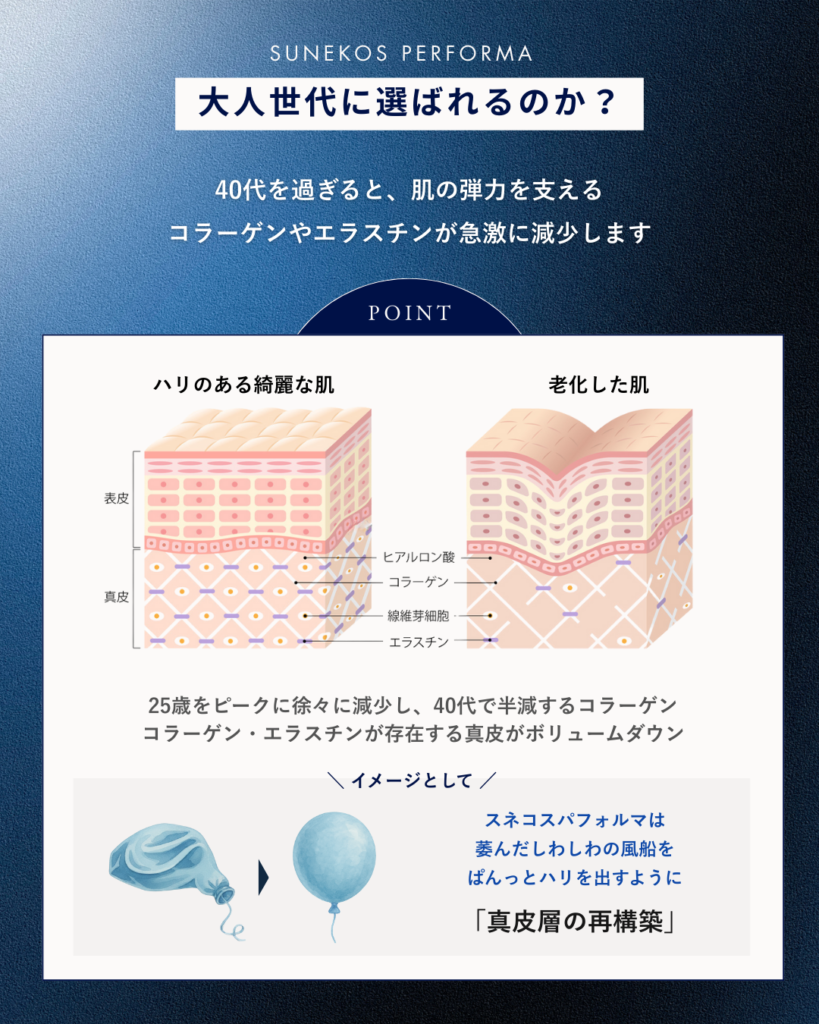 40代を過ぎると、肌の弾力を支えるコラーゲンやエラスチンが急激に減少します。