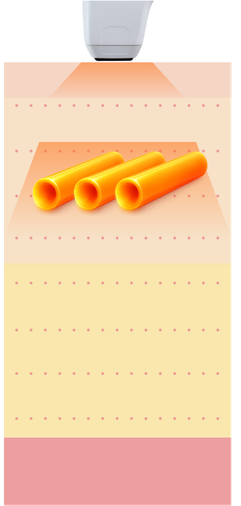 皮膚表面や深い組織にダメージを与えることなく、真皮1.5mm層を中心に、コラーゲン再生に最適な60〜70℃**の熱エネルギーを「円柱状」に照射。この深さと温度で正確にアプローチできるのは、世界で唯一ソフウェーブだけです。