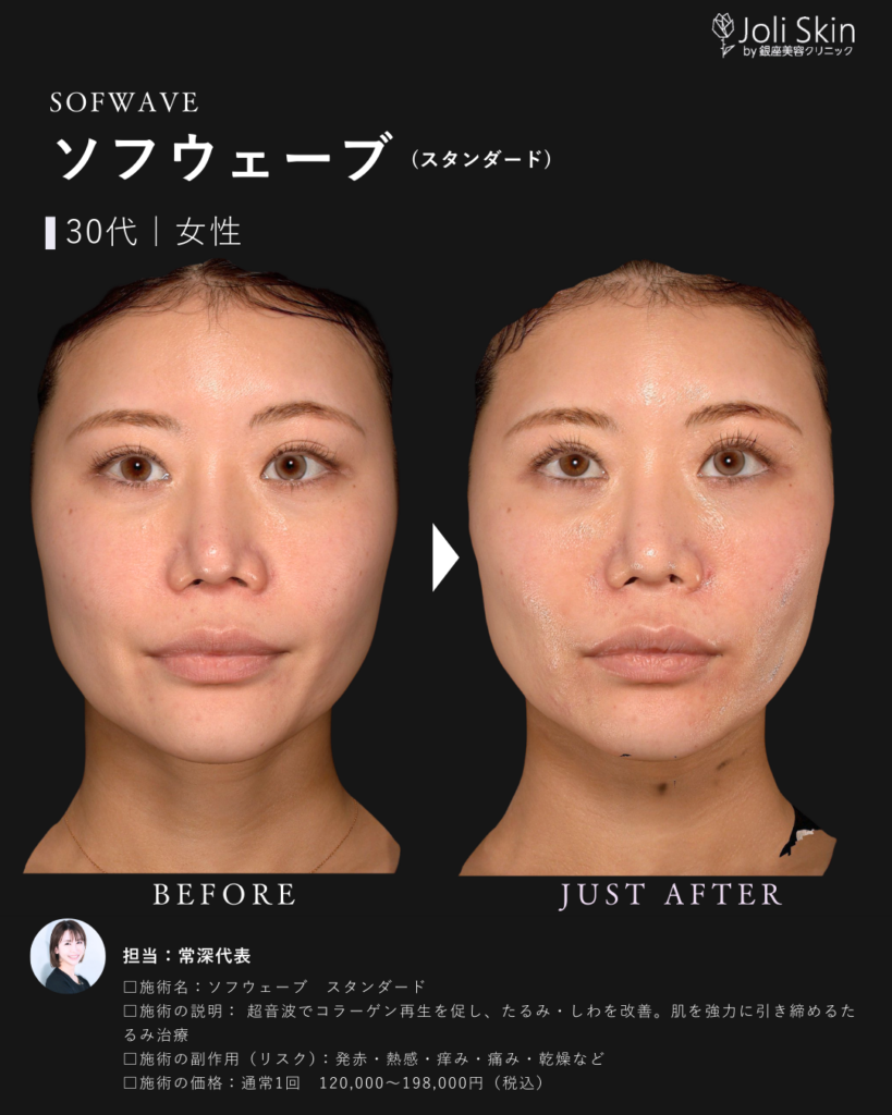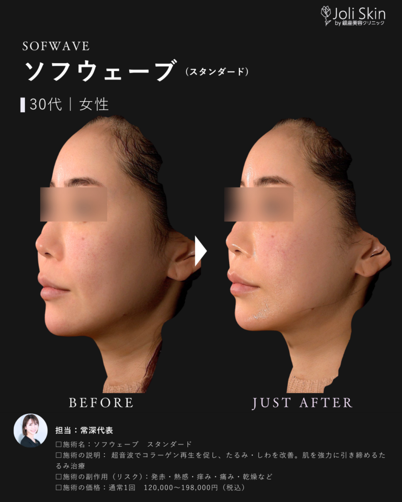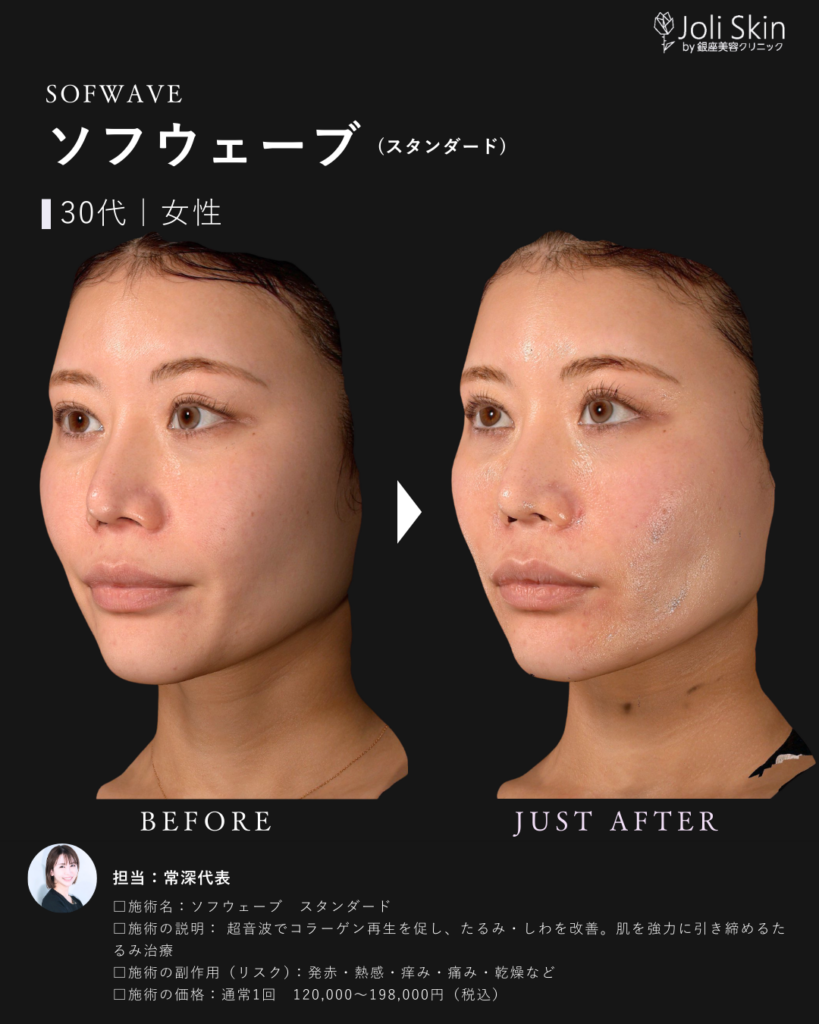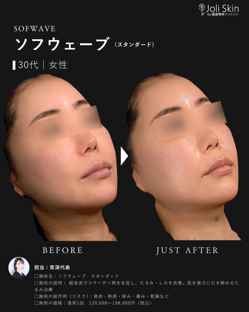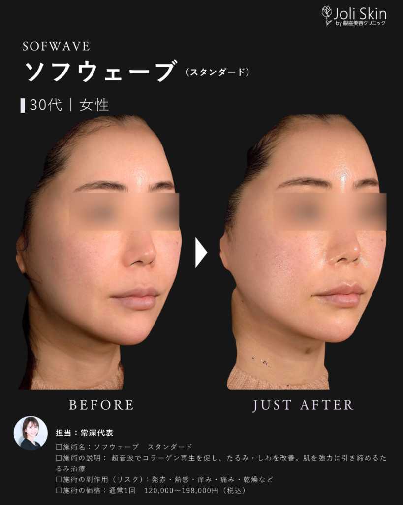 | 副作用・ダウンタイム・リスク | ・術後の経過について 照射後、一時的に軽い赤み、むくみ、不快感や押し痛などの症状が出ることがありますが、通常は数時間から数日以内に自然に落ち着きますのでご安心ください。 ・効果のあらわれ方について 効果のあらわれ方には個人差がございます。1回の治療でも変化を実感いただけますが、お肌の状態によっては、ご希望のイメージに近づけるために継続した治療をご提案させていただく場合がございます。 ・万が一のトラブルへの対応 万が一、通常とは異なる腫れや赤み、熱感、水疱などが現れた場合や、予測できない副作用が生じた場合には、速やかに当院へご連絡ください。医師が責任を持って診察し、適切な処置・治療を行います。 ソフウェーブの前の肌育注射は1ヶ月空けてください。 |