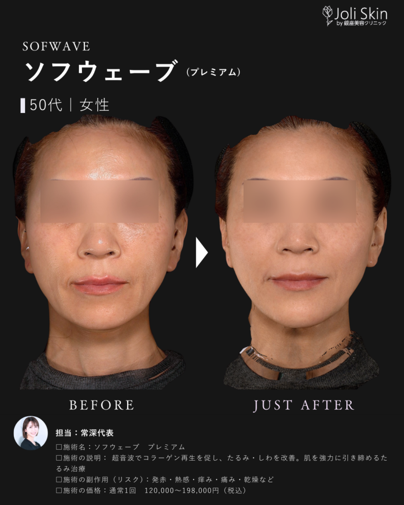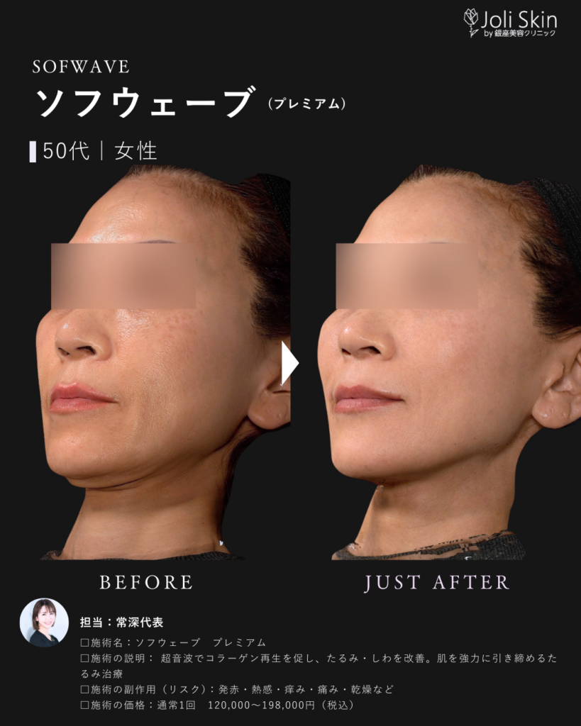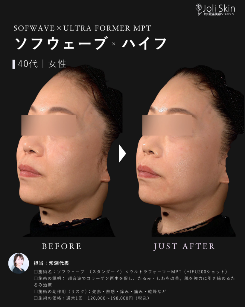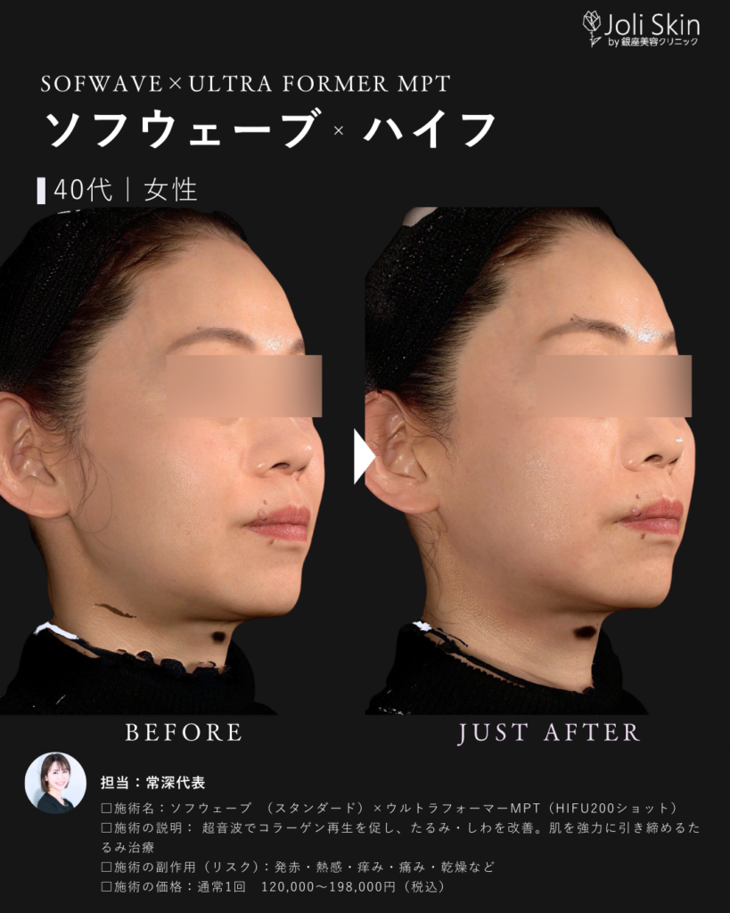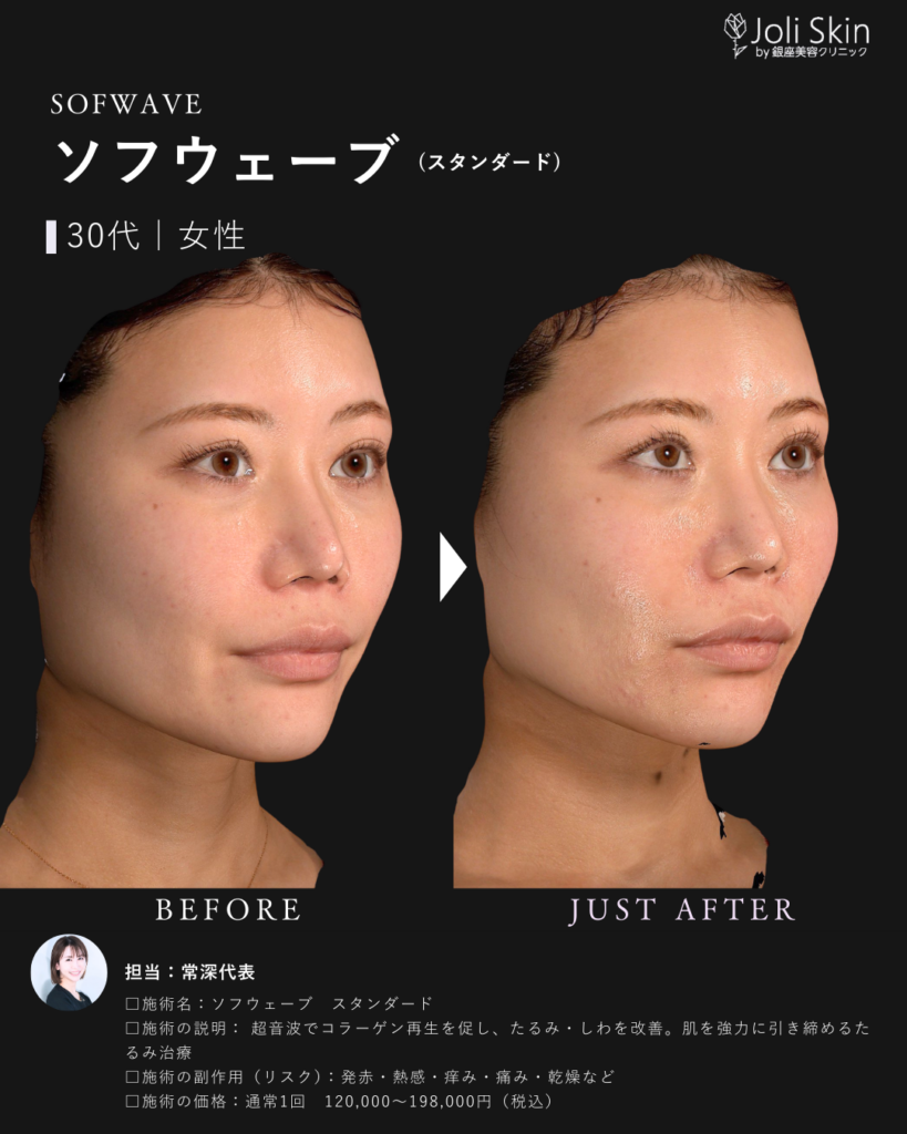 | 副作用・ダウンタイム・リスク | ・術後の経過について 照射後、一時的に軽い赤み、むくみ、不快感や押し痛などの症状が出ることがありますが、通常は数時間から数日以内に自然に落ち着きますのでご安心ください。 ・効果のあらわれ方について 効果のあらわれ方には個人差がございます。1回の治療でも変化を実感いただけますが、お肌の状態によっては、ご希望のイメージに近づけるために継続した治療をご提案させていただく場合がございます。 ・万が一のトラブルへの対応 万が一、通常とは異なる腫れや赤み、熱感、水疱などが現れた場合や、予測できない副作用が生じた場合には、速やかに当院へご連絡ください。医師が責任を持って診察し、適切な処置・治療を行います。 ソフウェーブの前の肌育注射は1ヶ月空けてください。 |