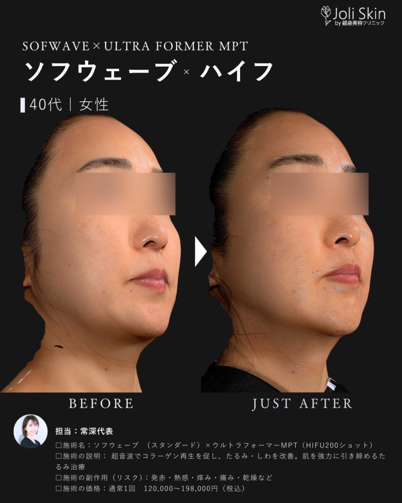HIFUは「深い層からの引き上げ」、サーマクールは「脂肪層の引き締め」が得意です。一方、ソフウェーブは「真皮層のハリ・弾力」に特化しています。脂肪を減らさずに肌をピタッと密着させたい方に最適です。