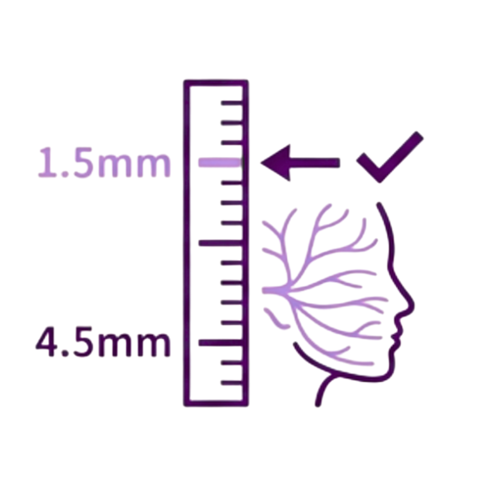 | Sofcool™ 統合冷却システム 表皮を保護しながら 高エネルギーを照射が可能 熱傷リスクを最小化 | 神経損傷リスク なし 1.5mm深度は主要な 顔面神経枝よりも浅い層 引用研究において 神経麻痺の報告例ゼロ※ | 疼痛スコア ダウンタイム 疼痛スコア 平均 3.9-6.6(10段階) 表面麻酔とクーリングで 管理可能 ダウンタイムなし |