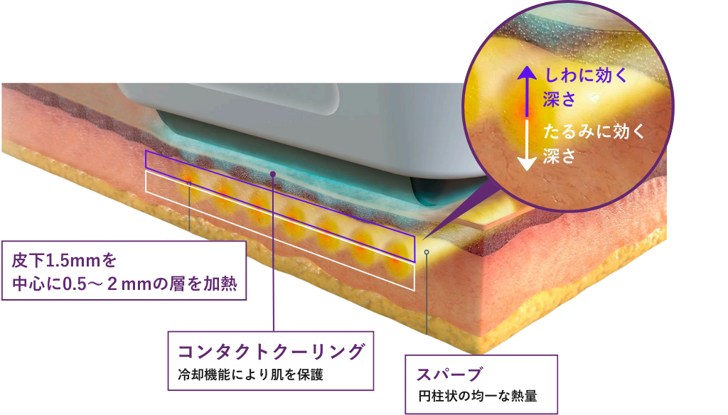 皮膚表面や深い組織にダメージを与えることなく、真皮1.5mm〜2.0mm層を中心に、コラーゲン再生に最適な60〜70℃の熱エネルギーを「円柱状」に照射。この深さと温度で正確にアプローチできるのは、世界で唯一ソフウェーブだけです。